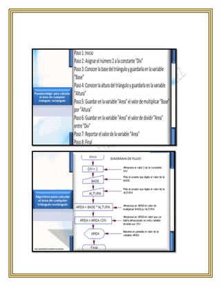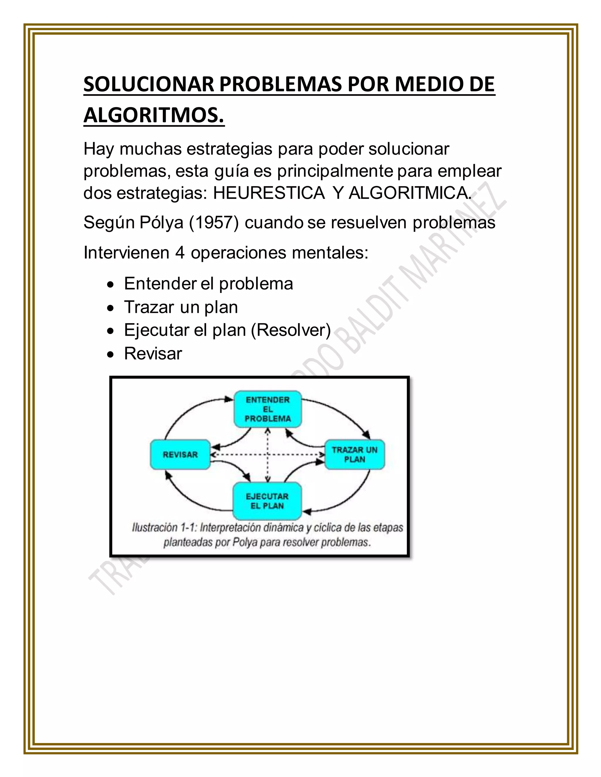 Este documento describe estrategias para resolver problemas mediante algoritmos y heurísticas. Explica las cuatro etapas del método de Polya para resolver problemas: comprender el problema, trazar un plan, ejecutar el plan y revisar. Luego presenta un ejemplo numérico resuelto paso a paso y concluye explicando que los algoritmos deben ser realizables, comprensibles y precisos.