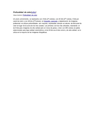 Un píxel es la unidad básica que compone una imagen digital. Es el punto más pequeño que puede representar un color. Las imágenes digitales se componen de una matriz de píxeles, donde cada píxel se codifica mediante bits para representar su color y brillo. Existen diferentes modelos de color como RGB y CMYK para codificar los píxeles, y diferentes profundidades de color como 8, 24 o 48 bits por píxel para representar más o menos variaciones de color.