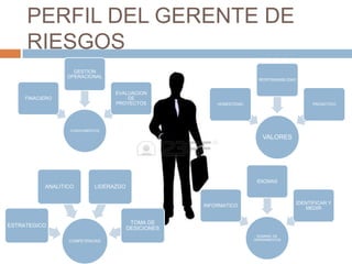 El documento presenta información sobre el perfil y funciones de un gerente de riesgos. Detalla los conocimientos y competencias necesarios como finanzas, gestión, evaluación de proyectos, idiomas, habilidades analíticas y de liderazgo. Explica las funciones básicas de un gerente de riesgos como definir métodos para identificar, medir y reportar riesgos. También presenta las funciones específicas como desarrollar metodologías de evaluación de riesgos operacionales y participar en el diseño de nuevos procesos