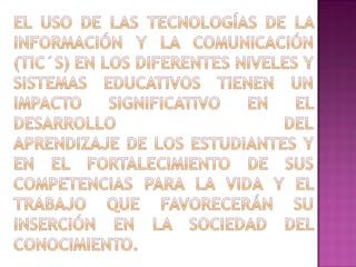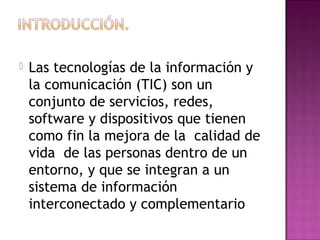 El documento describe el uso de Slideshare como una herramienta para que los estudiantes compartan presentaciones de PowerPoint sobre los temas cubiertos en clase. Los estudiantes subirán diariamente sus presentaciones a Slideshare para que otros compañeros que no pudieron asistir a clase puedan mantenerse al día con los materiales. El documento también explica que las TIC facilitan la comunicación y el aprendizaje a distancia.
