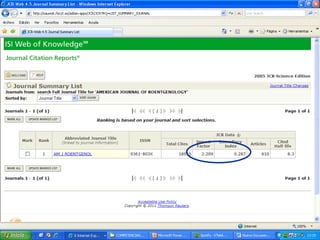 El documento describe un ejercicio para evaluar diferentes tratamientos para la lumbalgia utilizando las bases de datos SCOPUS, JCR y SJR. El tema de investigación elegido fue "Diferentes tratamientos actuales para la lumbalgia". Se realizó una búsqueda en SCOPUS utilizando los booleanos "AND" y "OR", se seleccionaron las 5 revisiones más citadas y se observó el índice H del primer autor (27). Luego, se consultó el factor de impacto, índice de inmediatez, puesto y cuartil de cada una de las