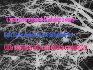 Nuestro cerebro es una maravilla indispensable para el ser humano. Contiene aproximadamente 100 mil millones de neuronas y cada una funciona como una potente computadora. El cerebro tiene dos hemisferios unidos por 300 millones de células nerviosas. Las funciones exclusivas de los seres humanos incluyen caminar erguidos, oponer el pulgar e índice, hablar, escribir y leer. El cerebro se divide en tres partes que controlan el cuerpo, las emociones y la capacidad de pensar de manera más compleja. La dieta afecta