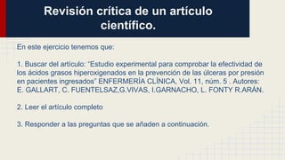 Los autores investigaron la efectividad de los ácidos grasos hiperoxigenados en la prevención de úlceras por presión en pacientes hospitalizados. Dividieron una muestra de 192 pacientes aleatoriamente en un grupo control y uno experimental, aplicando ácidos grasos solo a este último. Hallaron una incidencia de úlceras del 35% en el grupo control y del 19% en el experimental, concluyendo que los ácidos grasos reducen la incidencia de úlceras por presión.