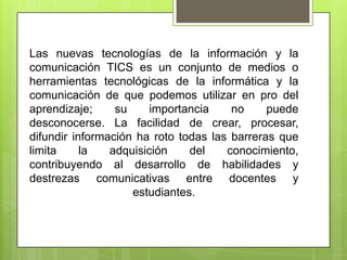 Las TIC (tecnologías de la información y comunicación) son importantes para la educación porque facilitan el acceso a la información y rompen barreras para la adquisición del conocimiento. Las TIC están transformando la forma de enseñar, aprender y los roles del maestro y el estudiante. Las TIC ofrecen diversos recursos de apoyo para la enseñanza como material didáctico, entornos virtuales e internet que promueven un aprendizaje significativo, activo y flexible.