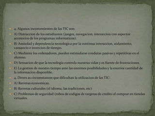 Las TIC ofrecen oportunidades y desafíos para la educación. Pueden mejorar la eficacia educativa y permitir la flexibilidad en los estudios, pero también pueden distraer a los estudiantes y causar dependencia tecnológica. Los docentes ahora guían a los estudiantes para que usen las herramientas TIC y exploren información, en lugar de ser la única fuente de conocimiento. Se necesita formación continua para los profesores y el compromiso de toda la comunidad educativa para aprovechar plenamente las ventajas de