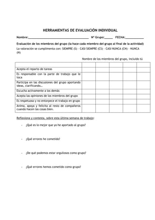 Este documento presenta las herramientas para la evaluación individual y grupal del aprendizaje cooperativo. Incluye un diario reflexivo que los estudiantes completan en grupo después de cada sesión para evaluar lo que aprendieron, sus logros y errores. También incluye una rúbrica de auto y coevaluación que los estudiantes usan para evaluar su propio desempeño y el de sus compañeros en aspectos como la participación, la escucha activa, el cumplimiento de tareas y la resolución de problemas.