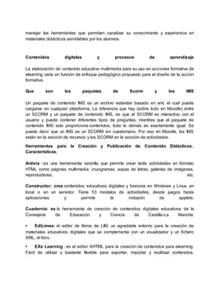 Las herramientas digitales facilitan la creación y publicación de contenidos educativos al integrar fácilmente proyectos desarrollados en entornos digitales y aumentar su difusión. Algunas de estas herramientas son EXe Learning, que permite empaquetar contenidos como SCORM para plataformas como Moodle, y Lams, que permite crear actividades colaborativas. Estas herramientas ofrecen ventajas como la publicación instantánea y permiten pensar, escribir, compartir y participar, aunque los profesores deben