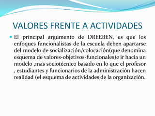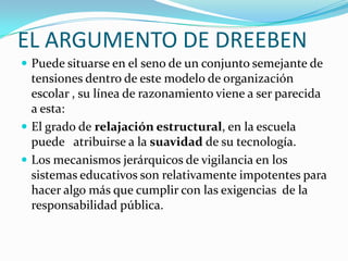 El documento discute el argumento de Dreeben de que los enfoques funcionalistas de la escuela deben alejarse del modelo de socialización/colocación y adoptar un enfoque más sociotécnico centrado en las actividades reales de profesores, estudiantes y administradores. También analiza la teoría de la burocracia de Weber, quien definía la burocracia de forma "típica ideal" en relación con diferentes formas administrativas basadas en tareas reguladas, división del trabajo, jerarquía y normas.