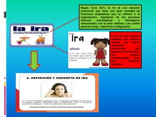 La ira es una emoción adaptativa relacionada con la defensa personal, que puede influir negativamente en el aprendizaje y la regulación emocional. Se identifica en diversos trastornos mentales, incluyendo el trastorno explosivo intermitente y el trastorno de personalidad antisocial. Para manejar la ira, se recomienda mantener la calma, practicar técnicas de relajación, y buscar ayuda profesional si es necesario.
