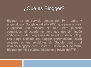 ¿Qué es Blogger? Bloggeres un servicio creado por Pyra Labs, y adquirido por Google en el año 2003, que permite crear y publicar una bitácora el línea. Para publicar contenidos, el usuario no tiene que escribir ningún código o instalar programas de servidor o de scripting. Los blogs alojados en Blogger generalmente están alojados en los servidores de Google dentro del dominio blogspot.com. Hasta el 30 de abril de 2010, Blogger permitió publicar bitácoras a través de FTP.