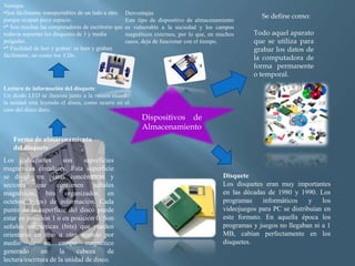 Este documento describe los diferentes dispositivos de almacenamiento que se han utilizado desde 1980 hasta la actualidad, incluyendo disquetes, CD-ROM, DVD, discos duros, memorias USB, memorias SD y unidades flash. Cada dispositivo tiene ventajas e inconvenientes en cuanto a capacidad, velocidad, portabilidad y durabilidad.