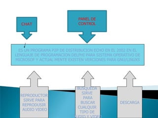 Este documento explica las funciones básicas del programa P2P Ares, incluyendo buscar archivos, descargar archivos de audio y video, y reproducir archivos descargados. Ares permite a los usuarios buscar cualquier tipo de archivo, seleccionar uno para descargar, y reproducir archivos descargados.