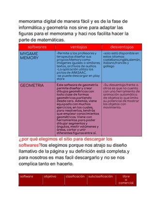 Este documento presenta dos softwares, MyGame Memory y Geometría, que serán utilizados por un equipo de estudiantes para su tarea de Informática 2. MyGame Memory les permitirá crear un memorama digital de manera fácil utilizando figuras, textos y archivos de audio. Geometría les dará las herramientas para diseñar y adaptar figuras geométricas para el memorama y facilitar la parte de matemáticas. El documento también describe las ventajas y desventajas de cada software.