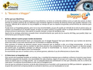 Este documento presenta diversas herramientas y estrategias para crear páginas web y blogs con fines de mercadeo en internet. Explica cómo usar WordPress, obtener un dominio y hospedaje, instalar plugins, crear contenido y usar RSS feeds. También describe herramientas como Constant Contact, Traffic Geyser e Instant Customer para captar clientes a través de correos, videos y eventos en vivo. Finalmente, presenta a dos empresarios y sus filosofías de mercadeo enfocadas en satisfacer al cliente.