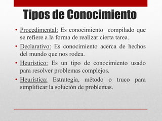 El documento describe diferentes tipos de conocimiento, incluyendo conocimiento procedimental, declarativo y heurístico. También explica cómo se representa el conocimiento en organismos biológicos, seres humanos, computadoras y lógica simbólica formal, usando ejemplos como neuronas, lenguaje y estados eléctricos/magnéticos. Por último, menciona formas estructuradas para representar conocimiento como redes asociativas, estructuras marco y representaciones orientadas a objetos.