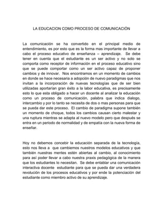 Este documento analiza la importancia de que los profesores conciban la educación como un proceso de comunicación y aprendizaje activo entre estudiantes y profesores, y la necesidad de incorporar nuevas tecnologías y estrategias de comunicación interactiva para mejorar los resultados educativos. También destaca la responsabilidad de los profesores de actualizarse y capacitarse para utilizar estas herramientas de forma que motiven a los estudiantes y los preparen para funcionar en una sociedad globalizada.