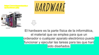 El documento define el hardware como la parte física de la computadora que permite que funcione y ejecute tareas, el software como una secuencia de instrucciones que gestiona y modifica datos, y el sistema operativo como un conjunto de programas que administra los periféricos, inicializa el hardware, y mantiene la integridad del sistema.