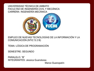 Este documento describe la lógica de programación y los algoritmos. Explica que la lógica es el razonamiento para resolver problemas, mientras que un algoritmo es un procedimiento mecánico y seguro para obtener resultados. Detalla las partes de un algoritmo como entrada, proceso y salida, y los tipos de algoritmos como cualitativo y cuantitativo. Concluye resaltando la relación entre lógica y algoritmos para dar solución a problemas.