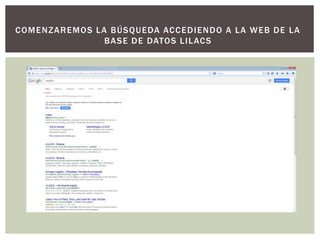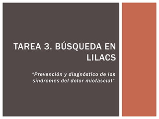 Este documento describe los pasos para realizar una búsqueda en la base de datos LILACS sobre la prevención y diagnóstico de los síndromes del dolor miofascial. Incluye introducir una estrategia de búsqueda, filtrar por idioma español, seleccionar 5 documentos relevantes, descargarlos y guardarlos en Mendeley para poder añadir la información y bibliografía a trabajos futuros.