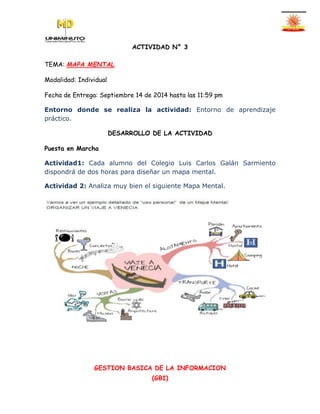 Este documento presenta un horario de clases semanal para el curso de Gestión Básica de la Información (GBI). Incluye actividades como introducción a la tecnología, programación básica y gestión de la información. La actividad 3 pide a los estudiantes completar un cuadro analizando un mapa mental sobre un viaje a Venecia. Luego, la actividad 4 lista 7 reglas básicas para la elaboración de mapas mentales, como empezar en el centro de la hoja y usar colores y palabras clave. Finalmente, la