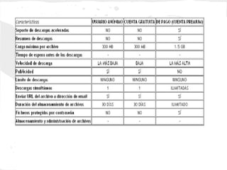 Este documento analiza diferentes sitios de almacenamiento en Internet como Badongo, MediaFire, SendSpace, RapidShare y Gigasize, que permiten almacenar y compartir archivos en línea de forma gratuita. También describe a Dropbox, un sistema que sincroniza archivos entre dispositivos y ofrece copias de seguridad, con una capacidad de 2GB. Finalmente, concluye resumiendo los principales sitios de almacenamiento y sus capacidades, además de explicar las funciones clave de Dropbox.