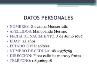 El documento presenta el currículum vitae de Giovanna Monserrath Manobanda Merino. Incluye información personal como su nombre, fecha de nacimiento, dirección y educación. Giovanna asistió a varias escuelas primarias y secundarias y actualmente estudia Administración de Empresas en la Universidad Tecnológica Indoamerica y el primer semestre de Idiomas en la Universidad Técnica de Ambato. También tomó un curso de suficiencia en inglés y tuvo experiencia laboral en el Centro Educativo Integral She