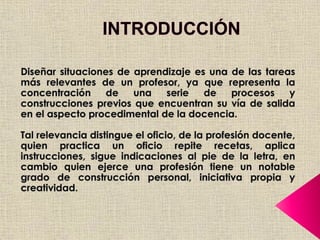Este documento presenta un resumen de un proyecto de maestría en educación especial sobre el diseño de situaciones de aprendizaje. Incluye la definición de planeación e instrucción, un decálogo para la planeación por competencias, y un ejemplo de formato de planeación con datos institucionales, competencias, segmento curricular, actividad y evaluación.