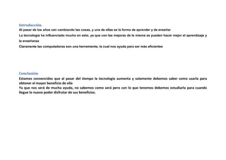 El documento presenta un resumen de la evolución del uso de computadoras en el proceso de enseñanza-aprendizaje desde la década de 1950 hasta la actualidad. Comenzó con máquinas de enseñanza basadas en conductismo, luego evolucionó a un enfoque más centrado en el estudiante influenciado por Piaget, y más recientemente la computadora personal permitió un mayor uso flexible en todas las asignaturas.