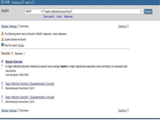 El documento describe los pasos realizados para buscar artículos sobre atención domiciliaria a pacientes con esquizofrenia o psicosis maníaco depresiva en PubMed y Fama. Incluye búsquedas por términos MeSH, aplicación de filtros de fecha y disponibilidad de texto completo, salvando los resultados en RefWorks e importando la bibliografía.