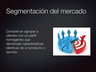 La segmentación de mercados consiste en agrupar clientes con perfiles similares. Un segmento de mercado debe ser fácilmente identificable, medible, accesible, con una reacción diferente a las propuestas de valor, lo suficientemente grande como para ser rentable y durable. Las variables más usadas para segmentar incluyen demográficas, geográficas y de estilo de vida. El comportamiento del consumidor online se estudia mediante su búsqueda, compra, uso y desecho de productos, así como por los dispositivos y factores que influyen