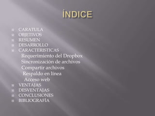 Dropbox permite compartir archivos en línea, sincronizar archivos entre dispositivos de forma automática, y acceder a los archivos desde cualquier lugar a través de Internet. Ofrece 2GB de almacenamiento gratuito y permite ampliar el espacio mediante invitaciones. Es una herramienta útil para el trabajo colaborativo.