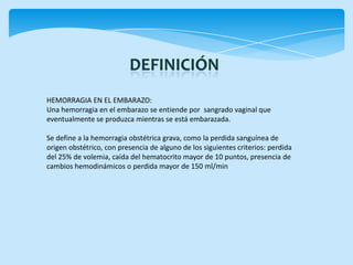 Este documento describe las causas y tratamientos de las hemorragias durante el embarazo. Las principales causas de hemorragia en el primer trimestre son el aborto, la amenaza de aborto, el embarazo ectópico y la enfermedad trofoblástica. En el tercer trimestre, las principales causas son la placenta previa, el desprendimiento prematuro de placenta y la vasa previa. Los tratamientos dependen de la causa y pueden incluir reposo, interrupción del embarazo quirúrgica o farmac