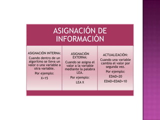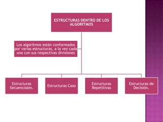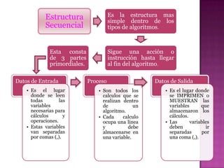 Los algoritmos son operaciones que incluyen operadores matemáticos y variables. Estos pueden realizar funciones como suma, resta, multiplicación, división y raíces. Un ejemplo de algoritmo muestra los pasos para calcular la multiplicación de dos números usando variables para almacenar los números de entrada y el resultado. Primero se leen los números, luego se multiplican almacenando el producto en una variable, y finalmente se imprime el resultado.