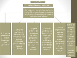 Este documento describe los virus informáticos y los antivirus. Los virus se instalan sin permiso en los ordenadores y se propagan a otros, realizando funciones destructivas. Los antivirus son herramientas que eliminan los virus mediante la detección, el análisis y la actualización continua para proteger los ordenadores.