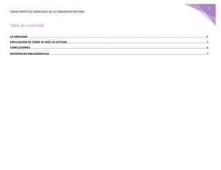 El documento describe las características esenciales de la comunicación oral. Explica que la oralidad y la escritura son dos formas distintas pero relacionadas de producir lenguaje. Luego detalla las diferencias entre la comunicación oral y escrita descritas por Barrera y Fracca en 1999. Finalmente, resume las perspectivas de Walter J. Ong sobre la oralidad como un pensamiento profundamente arraigado en el sonido, no solo como comunicación.