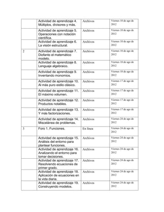 Este documento presenta un cronograma de tareas para un curso de matemáticas dividido en 4 unidades temáticas. Cada unidad incluye varias actividades de aprendizaje que deben completarse y entregarse para determinadas fechas, así como foros de discusión en línea. Las tareas abarcan temas como números, álgebra, funciones y ecuaciones de primer y segundo grado.
