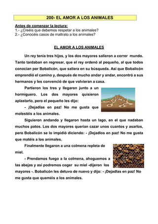 El cuento narra las aventuras de Bobalicón y sus dos hermanos mayores. Bobalicón defiende a los animales que encuentran, mientras que sus hermanos quieren dañarlos. Para romper un hechizo en un castillo, Bobalicón debe completar tres pruebas y recibe ayuda de hormigas, patos y abejas a las que previamente había ayudado. Al final, Bobalicón se casa con la princesa y enseña a todos a amar a los animales.