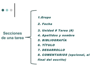 El documento proporciona instrucciones sobre cómo registrar y organizar las secciones de una tarea escolar, incluyendo el grupo, fecha, unidad y número de tarea, nombres de los estudiantes, bibliografía, título, desarrollo y comentarios. También incluye un ejemplo de cómo se vería la primera página de una tarea con las secciones correspondientes. Por último, proporciona normas sobre cómo citar diferentes tipos de fuentes como libros, artículos y páginas web.