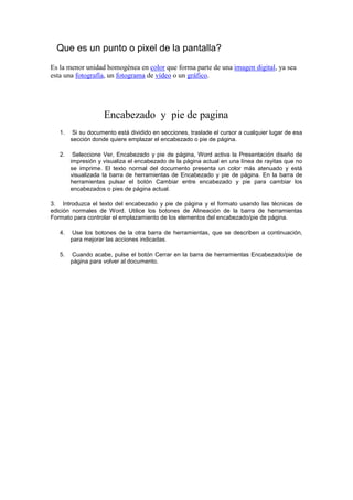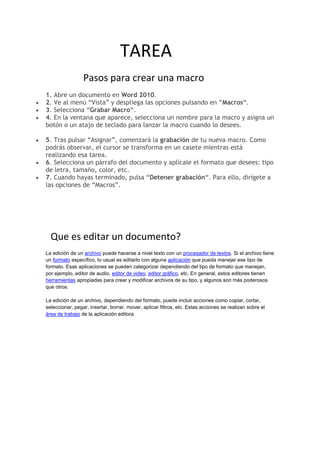 TAREA<br /> Pasos para crear una macro<br />1. Abre un documento en Word 2010.<br />2. Ve al menú “Vista” y despliega las opciones pulsando en “Macros“.<br />3. Selecciona “Grabar Macro“.<br />4. En la ventana que aparece, selecciona un nombre para la macro y asigna un botón o un atajo de teclado para lanzar la macro cuando lo desees.<br />5. Tras pulsar “Asignar”, comenzará la grabación de tu nueva macro. Como podrás observar, el cursor se transforma en un casete mientras está realizando esa tarea.<br />6. Selecciona un párrafo del documento y aplícale el formato que desees: tipo de letra, tamaño, color, etc.<br />7. Cuando hayas terminado, pulsa “Detener grabación“. Para ello, dirígete a las opciones de “Macros”.<br /> <br /> Que es editar un documento?<br />La edición de un archivo puede hacerse a nivel texto con un procesador de textos. Si el archivo tiene un formato específico, lo usual es editarlo con alguna aplicación que pueda manejar ese tipo de formato. Esas aplicaciones se pueden categorizar dependiendo del tipo de formato que manejan, por ejemplo, editor de audio, editor de video, editor gráfico, etc. En general, estos editores tienen herramientas apropiadas para crear y modificar archivos de su tipo, y algunos son más poderosos que otros.La edición de un archivo, dependiendo del formato, puede incluir acciones como copiar, cortar, seleccionar, pegar, insertar, borrar, mover, aplicar filtros, etc. Estas acciones se realizan sobre el área de trabajo de la aplicación editora<br /> <br /> Que es un punto o pixel de la pantalla?<br />Es la menor unidad homogénea en color que forma parte de una imagen digital, ya sea esta una fotografía, un fotograma de vídeo o un gráfico.<br /> <br /> Encabezado y pie de pagina<br />1. Si su documento está dividido en secciones, traslade el cursor a cualquier lugar de esa sección donde quiere emplazar el encabezado o pie de página.<br />2. Seleccione Ver, Encabezado y pie de página, Word activa la Presentación diseño de impresión y visualiza el encabezado de la página actual en una línea de rayitas que no se imprime. El texto normal del documento presenta un color más atenuado y está visualizada la barra de herramientas de Encabezado y pie de página. En la barra de herramientas pulsar el botón Cambiar entre encabezado y pie para cambiar los encabezados o pies de página actual.<br />3. Introduzca el texto del encabezado y pie de página y el formato usando las técnicas de edición normales de Word. Utilice los botones de Alineación de la barra de herramientas Formato para controlar el emplazamiento de los elementos del encabezado/pie de página.<br />4. Use los botones de la otra barra de herramientas, que se describen a continuación, para mejorar las acciones indicadas.<br />5. Cuando acabe, pulse el botón Cerrar en la barra de herramientas Encabezado/pie de página para volver al documento.<br />