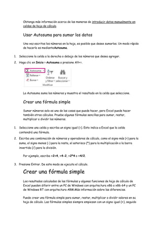 El documento explica las tareas básicas en Excel 2013, incluyendo cómo crear un nuevo libro, introducir datos en celdas, usar la función Autosuma para sumar datos automáticamente, y crear fórmulas simples usando operadores matemáticos como +, -, * y /. Excel permite organizar y analizar grandes cantidades de datos a través de su cuadrícula de celdas, filas y columnas.