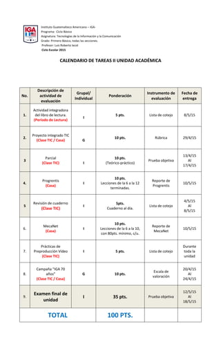 El calendario de tareas para la segunda unidad académica incluye 9 actividades evaluativas individuales y grupales que abarcan desde proyectos integrados en TIC, parciales, revisiones de cuadernos, hasta exámenes finales. Las actividades serán evaluadas a través de listas de cotejo, rúbricas, pruebas objetivas y reportes electrónicos, y representan el 100% de la calificación de la unidad.