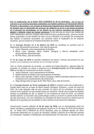 DOCUMENTO TAREAS ESCOLARES CEIP HISPANIDAD ELABORADO CON LA PARTICIPACIÓN DE LA COMUNIDAD EDUCATIVA