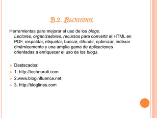 Este documento presenta varias herramientas en línea para organizar y compartir información de manera colaborativa. Incluye blogs, wikis, hojas de cálculo, presentaciones, calendarios, fotos, video, buscadores, lectores RSS, y marcadores sociales. El objetivo es reducir la sobrecarga de información a través de métodos taxonómicos y clasificación social.