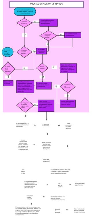 PROCESO DE ACCIONDE TUTELALos ciudadanos o la defensoría del pueblo presenta a solicitud ante cualquier juez.<br />NoLa presenta por escrito?El juez debe escribir por la persona (en caso de desconocimiento)<br />Implican responsabilidad y se asumen como ciertos los hechos<br />SiSe corrige en el plazo adecuado?SiSiSiSiSiSiSiSiSiNoNoNoNoNoLo expide en el plazo indicado?NoNoNoNoNoNoNoFallo a favor del solicitanteEl juez podrá disponer de lo necesario para que sea cumplido sin más requisitos en 48 horas, y se dirigirá al superior del responsable para exigirle que lo haga cumplir en 48 horas, y que abra el procedimiento disciplinario correspondiente contra el mismoEl juez los inculpa de desacato hasta que cumplan la sentenciaSe cumple la sentencia?Se cumple la sentencia y se pagan las costas o indemnizaciones necesariasEl solicitante debe pagar las costasEl juez exige al órgano la expedición del acto administrativo para que se ejerza el derecho. (Plazo 48 horas).El juez notifica la sentencia de la corte a las partes y adopta las decisiones necesarias para llevarla a caboSe le notifica al juezEl fallo tiene fundamento?Puede solucionar pruebas para proferir un nuevo fallo en los 20 días siguientesLa corte constitucional selecciona, a su criterio, las tutelas que revisara. Si es necesario se revoca o modifica el falloEl juez envía el fallo a la corte constitucional para ser revisadoPuede revocarlo en los 20 días siguientesEl fallo tiene fundamentoEl juez remite el expediente al superior correspondiente para que decida la impugnación (plazo 2 días)Es impugnado el fallo por algunas de las partes?El juez dicta el fallo (plazo 10 días después de la solicitud)Se entregan los informes?El juez debe pedir los documentos o informes al órgano contra quién interpuso la acción (plazo de tres días)Se notifica a las partes inmediatamente (solicitante. Defensoría del pueblo y órgano correspondiente) si éstas impugnan el fallo deben reportarlo en el plazo de tres días. El juez rechaza la solicitudNecesita pruebas? Es necesario corregir la solicitud?La persona debe corregirla en tres díasEl juez debe continuar con el procesoEl juez debe corregirla inmediatamenteEs necesario corregir la solicitud?<br />