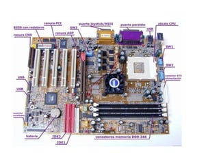 El documento describe varios componentes clave de una computadora, incluyendo el microprocesador, chipset, memoria RAM, zócalo del procesador, BIOS, bus PCI, tarjetas de expansión y periféricos de almacenamiento como discos duros SATA e IDE. Explica las funciones de cada componente y cómo se comunican entre sí para que la computadora funcione correctamente.
