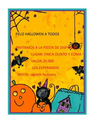 La primera invitación invita a una fiesta de disfraces llamada "Finca Ounto y Coma" el día de Halloween organizada por "Sayleth Fashions" con un costo de $20.000. La segunda nota es para Karen deseándole un feliz día del amor y la amistad y expresando gratitud por su apoyo incondicional.
