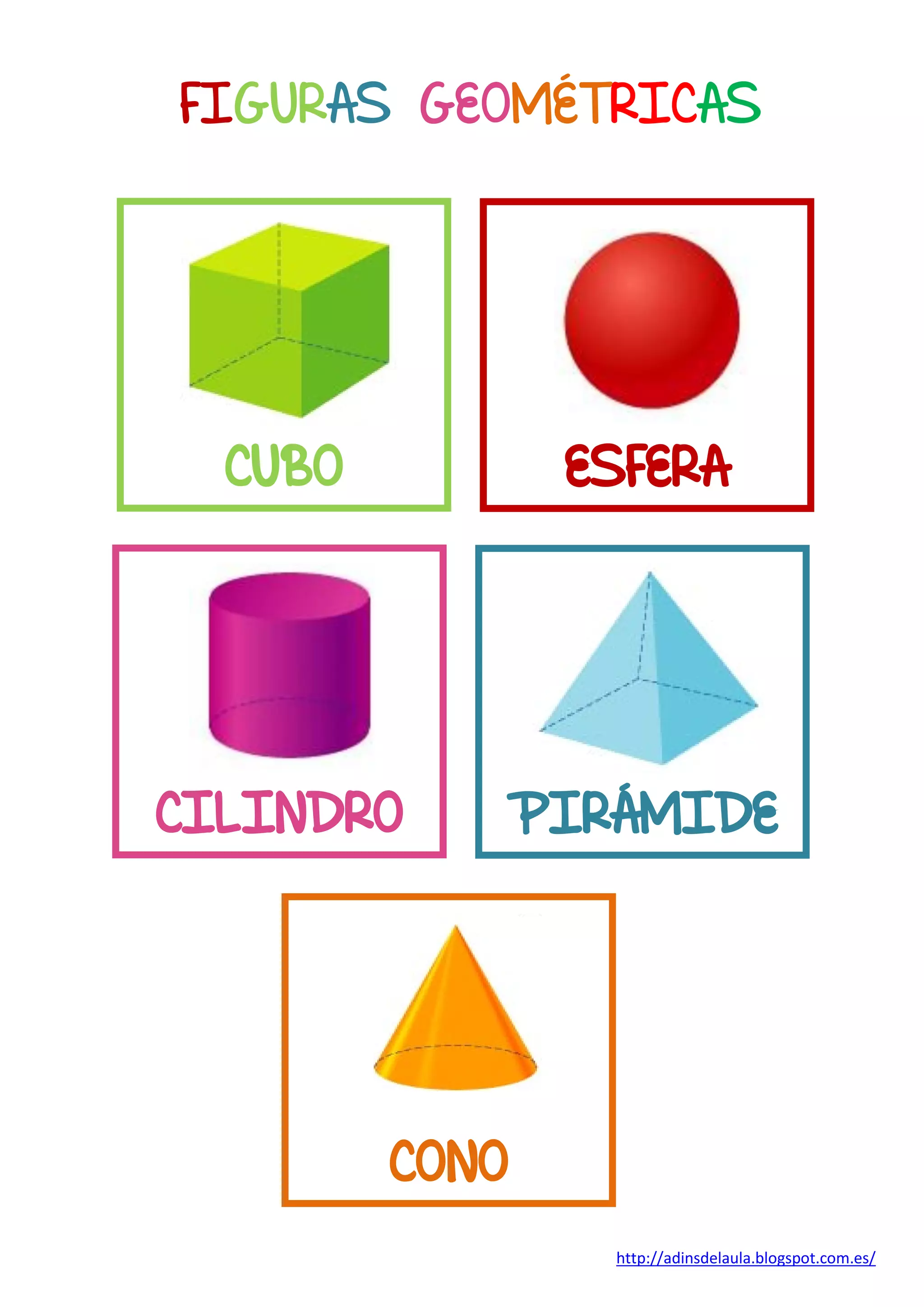 El documento presenta diferentes figuras geométricas como el cubo, la esfera, el cilindro, la pirámide y el cono.