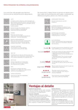 El documento es un catálogo tarifario de las calderas Ariston de octubre de 2011, que describe sus características, eficiencia energética y cuidado del medio ambiente. Se destacan prestaciones como el ahorro energético y la reducción de emisiones contaminantes, además de información sobre la instalación y mantenimiento de los productos. También incluye condiciones generales de venta y precios de diversos modelos y accesorios.
