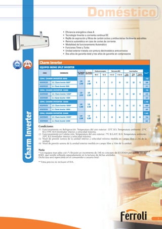 Este documento presenta varios modelos de aire acondicionado de las marcas Charm Inverter, Space y Tandem Inverter. Se proporciona información técnica detallada como potencia frigorífica, clasificación energética, niveles sonoros y precios. Los modelos descritos incluyen equipos mono split, multi split y sistemas tandem.
