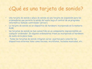 Una tarjeta de sonido es un dispositivo de hardware que se incorpora en la memoria RAM de un ordenador y permite la entrada y salida de audio mediante programas. Incluye puertos para conectar altavoces, micrófonos u otros dispositivos y procesa señales de audio digitales para reproducir o sintetizar sonido.
